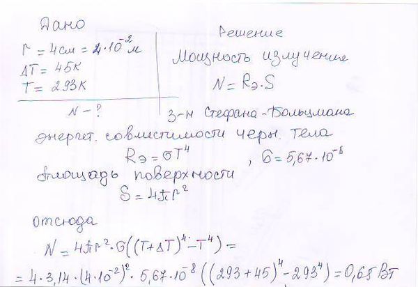Какую мощность надо подводить к зачернённому металлическому шарику радиусом 4 см, чтобы поддерживать его температуру на 45 К выше температуры окружающей среды 293 К? Считать, что тепло теряется только вследствие излучения.