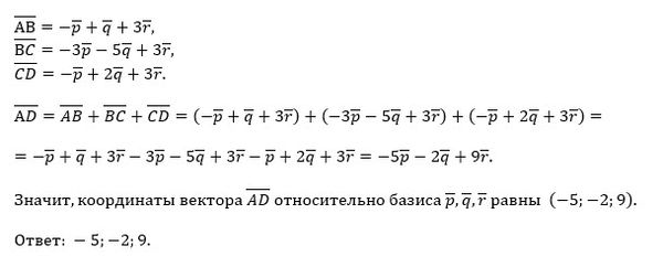 Найдите координаты вектора AD−−−− относительно базиса p−−,q−−,r−−.