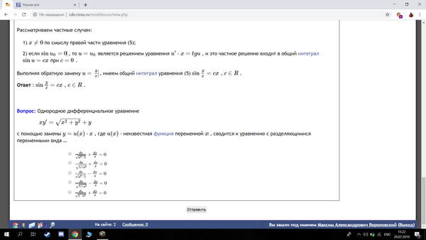 с помощью замены y = u(x) ⋅ x, где u(x) ‒ неизвестная функция переменной x, сводится к уравнению с разделяющимися переменными вида ...