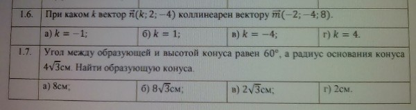 1.6. Так как векторы коллинеарны, то их координаты пропорциональны: коэффициент пропорциональности равен: –4:2=8:(–4)=–2, тогда k=–2:(–2)=1. Ответ: б)
