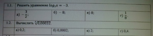 1.1 log_(2)x=-3 ⇒ x=2^(-3); [b]x=1/8[/b] 1.2 0,00032=0,2^5 корень пятой степени из 0,2^5 равен [b]0,2[/b]