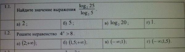 1.1 Применяем формулу перехода к другому основанию справа налево: log_(2)25/log_(2)5=log_(5)25=2 1.2 4^(x)=(2^(2))^(x)=2^(2x) 8=2^3 2^(2x)>2^(3) 2x>3 x>3/2 О т в е т. (1,5;+ ∞ )