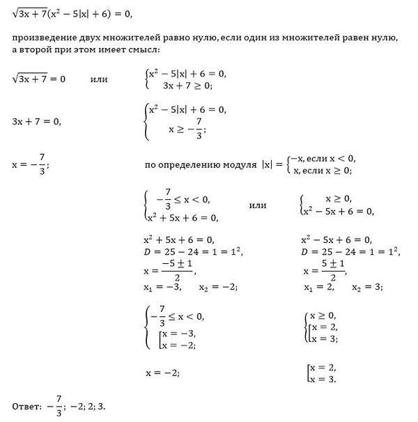 Решите уравнение sqrt(3x + 7) (x² - 5|x| + 6) = 0.