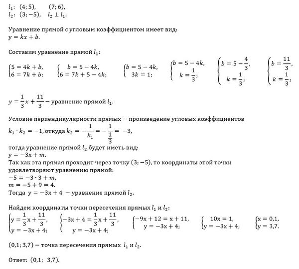Прямая l₁ проходит через точки (4, 5) и (7, 6) координатной плоскости. Прямая l₂ проходит через точку (3, -5) и перпендикулярна прямой l₁. Найдите координаты точки пересечения прямых l₁ и l₂.