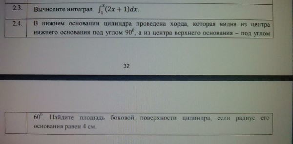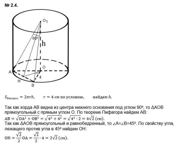 Помогите решить 2.3 и 2.4 2.4 В нижнем основании цилиндра проведена хорда, которая видна т центра нижнего основания под углом 90°, а из центра верхнего основания - под углом 60. Найдите площадь боковой поверхности цилиндра основания равен 4 см