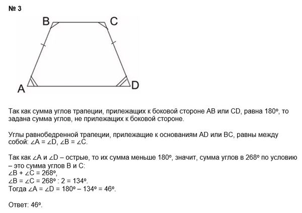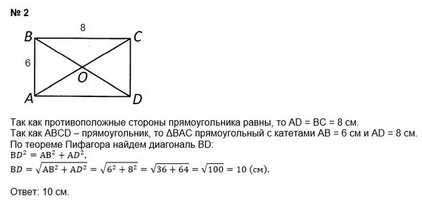 2. В прямоугольнике ABCD AB=6см, ВС=8см. Найти диагональ BD. 3. Сумма двух углов равнобедренной трапеции равна 268°. Найти меньший угол трапеции.