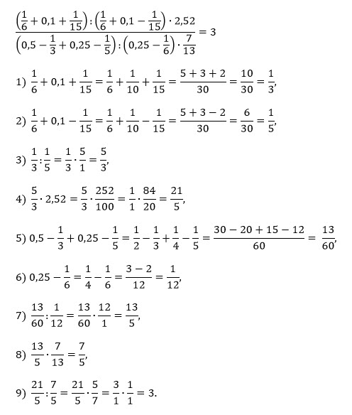 (1/6 + 0,1 + 1/15) : (1/6 + 0,1 - 1/15) * 2,52 ------------------------- (0,5 - 1/3 + 0,25 - 1/5) : (0,25 - 1/6) * 7/13 Это всё один пример напишите пожалуйста по действиям