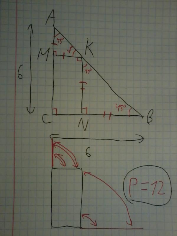 в треугольнике abc известно, что угол C равен 90 градусов, AC=BC=6см. Прямоугольник CMKN построен так, что точка M принадлежит катету AC, точка N - катету BC, а точка K-гипотенузе AB. Найдите периметр прямоугольника CMKN