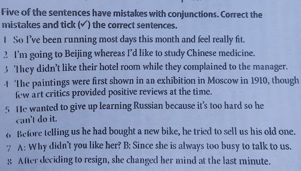1, 2 - верные 3. so вместо while 4. and вместо though 5 -верно 6. -верно 7. because вместо since 8. либо оставить так либо though вместо after