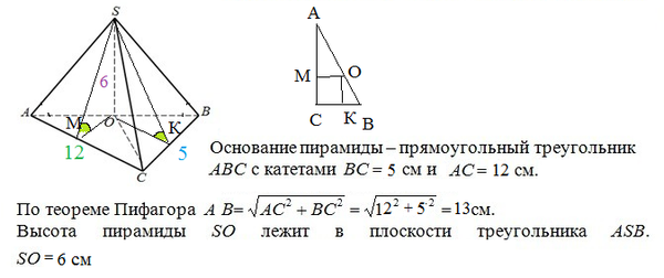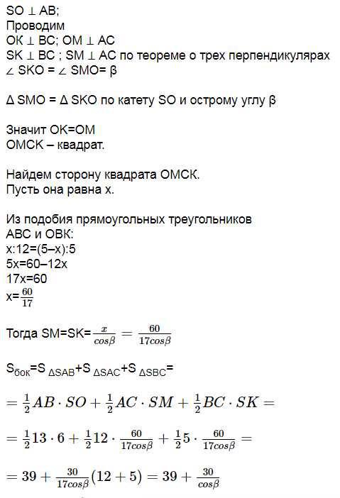 Основание пирамиды - прямоугольный треугольник с катетами 5 и 12. Боковая грань, проходящая через гипотенузу, перпендикулярна плоскости основания, а каждая другая боковая грань образует с плоскостью основания угол b. Найдите боковую поверхность этой пирамиды, если ее высота равна 6.