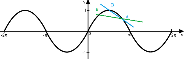 Возьмите на синусоиде произвольную точку А и проведите секущую АВ. Точку В перемещайте по синусоиде в направлении к точке А. Сформулируйте определение касательной к синусоиде и запишите его.