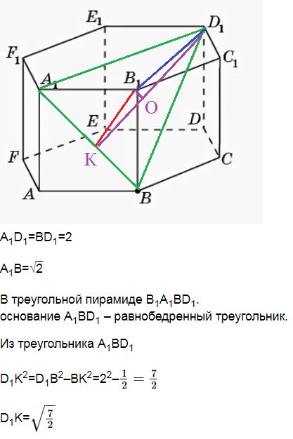 2. В правильной шестиугольной призме ABCDEFA1B1C1D1E1F1, все ребра которой равны 1, найдите расстояние от точки В1 до плоскости А1ВD1.