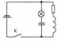 В электрической цепи, показанной на рисунке, ЭДС источника тока равна 12 В; емкость конденсатора 2 мФ; индуктивность катушки 5 мГн, сопротивление лампы 5 Ом и сопротивление резистора 3 Ом. В начальный момент времени ключ К замкнут. Какая энергия выделится в лампе после размыкания ключа? Внутренним сопротивлением источника тока, и проводов пренебречь.