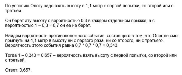 На зачёте по прыжкам в высоту каждому даётся три попытки, чтобы преодолеть высоту 1,1 метра с разбега. Девятиклассник Олег берёт такую высоту с вероятностью 0,3 в каждом отдельном прыжке. Найдите вероятность того, что Олег сдаст зачёт в этот раз.