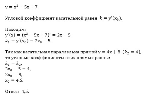 Прямая у=4x+8 параллельна касательной к графику функции у=x^2-5x+7. Найдите абсциссу точки касания.
