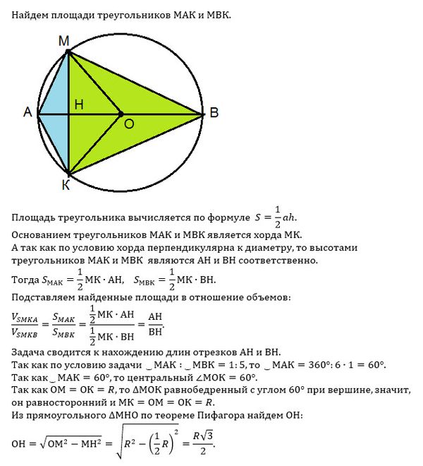 В конусе с вершиной S на окружности основания отмечены точки М и К так что хорда МК перпендикулярна диаметру АВ. Длины дуг, на которые точки М и К делят окружность относятся как 1:5.
