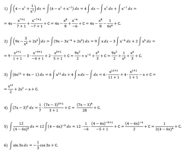Вариант 7. 1) ∫(4 - x^7 + (1/x^7))dx; 2) ∫(9x - (3/x^4) + 2x^5)dx; 3) ∫(6x^(11) + 4x - 1)dx; 4) ∫(7x - 3)^3 dx; 5) ∫(12dx/(4 - 6x)^5; 6) ∫ sin 3x dx.