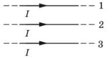 Как направлена сила Ампера, действующая на проводник 3 со стороны двух других (см. рисунок) [b](к нам, от нас, вверх, вниз)[/b]? Расстояние между соседними проводниками одинаковы. [i]Ответ запишите словом (словами)[/i].