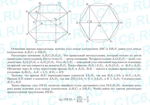 В правильной шестиугольной призме ABCDEFA1B1C1D1E1F1, все ребра которой равны 1, найдите тангенс угла между плоскостями ABC и DB1F1.