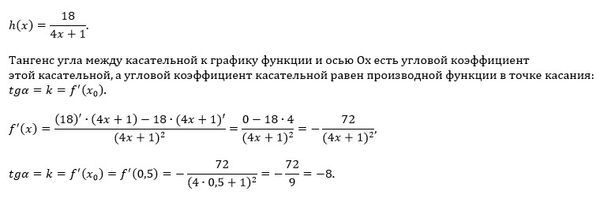 4. Найдите тангенс угла между касательной к графику функции у = h(х) в точке с абсциссой x_0 и осью x: h(x)=18/(4x+1), x_0=0,5.