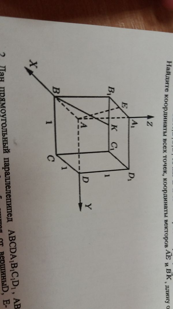 В кубе ABCDA1B1C1D1 точки E и K - середины ребер соответсвенно A1B1 и B1C1. Найдите координаты всех точек, координаты векторов AE и BK, длину отрезка DK.