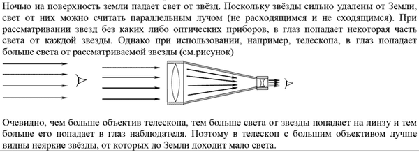 Для наблюдения за ночным небом два друга купили себе по телескопу. Устройство этих двух телескопов (см. схему) и используемые материалы абсолютно одинаковые. Единственное различие в том, что у одного из них диаметр объектива равен 15 см, а у другого – 30 см. Размеры окуляра и его оптическая сила у обоих телескопов одинаковые. В какой из телескопов лучше видны неяркие звёзды? Объясните свой ответ.