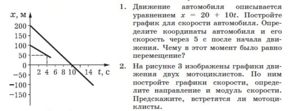 На рисунке 3 изображены графики движения двух мотоциклистов. По ним постройте графики скорости, определите направление и модуль скорости. Предскажите, встретятся ли мотоциклисты.