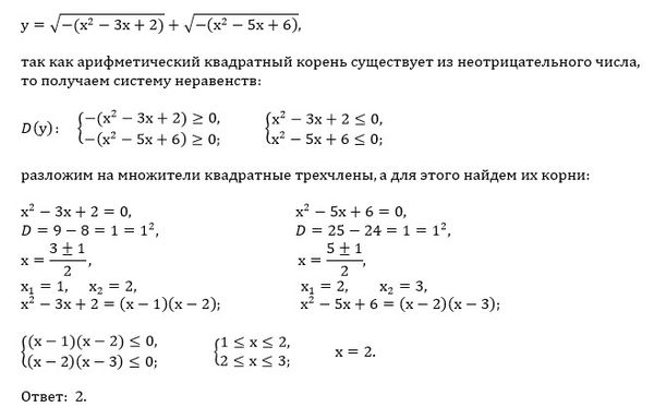 Найдите область определения функции y=sqrt(-(x^2 - 3x + 2))+sqrt(-(x^2-5x+6)) С подробным объяснением, пожалуйста, совсем не понимаю эту тему...