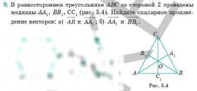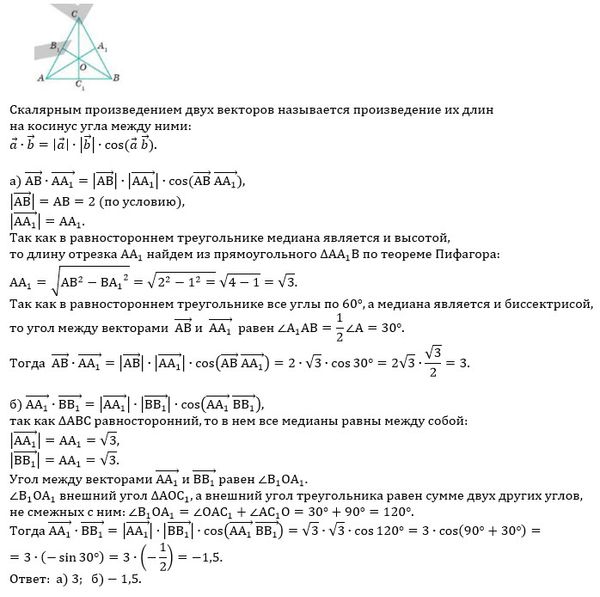 В равностороннем треугольнике ABC со стороной 2 проведены медианы AA1, BB1, CC1. Найдите скалярное произведение векторов AB и AA1, AA1 и BB1