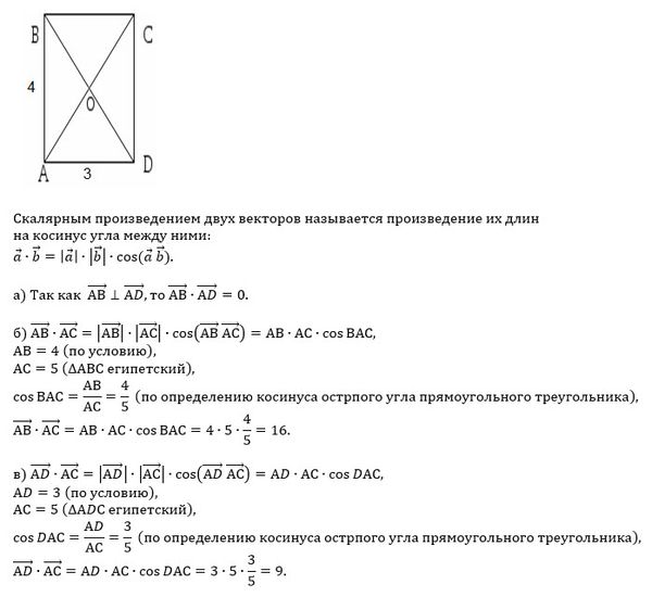 В прямоугольнике ABCD AB=4, AD=3. Найдите скалярное произведение векторов: а) AB и AD; б) AB и AC; в) AD и AC.