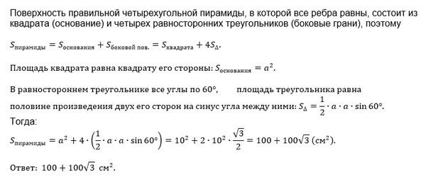 Найти площадь поверхности правильной четырехугольной пирамиды в которой все ребра равны 10 см.
