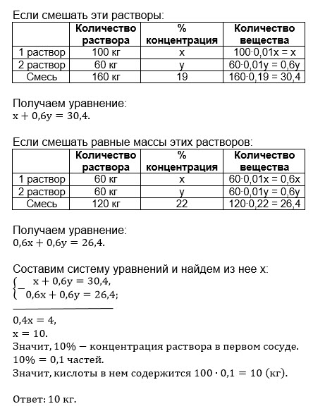 Имеются 2 сосуда. Первый содержит 100 кг, а второй - 60 кг раствора кислоты различной концентрации. Если эти растворы смешать, то получится раствор содержащий 19% кислоты. Если же смешать равные массы этих растворов, то получится раствор, содержащий 22% кислоты. Сколько кг кислоты содержится в первом сосуде.