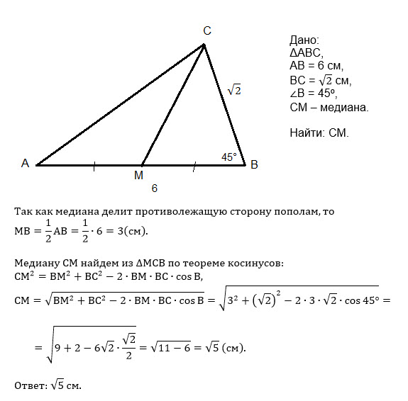В треугольнике АВС АВ = 6 см, ВС =sqrt(2)см, угол В = 45 градусов. Найти длину медианы, проведенной из вершины угла С.