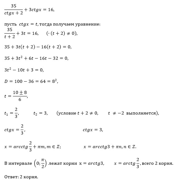 Найти число корней уравнения 35/(ctgx+2) + 3ctgx=16, принадлежащих интервалу ( 0; pi/2 )