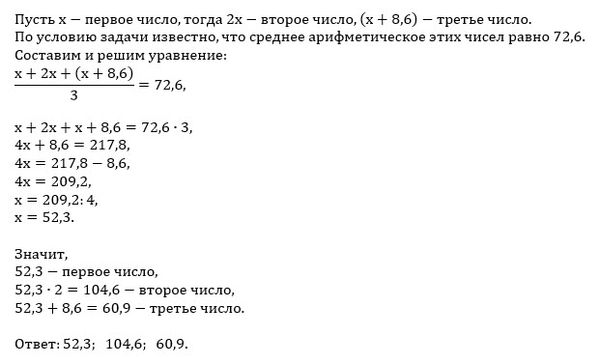 Среднее арифметическое трех чисел равно 72,6. Найти эти числа, если известно, что второе число больше первого в 2 раза, а третье на 8,6 больше первого.