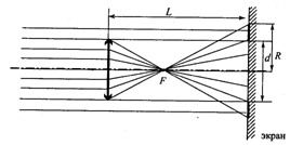Лучи, падающие на линзу, соберутся в ее заднем главном фокусе, а затем разойдутся из него конусом и попадут на экран, образуя на нем светлый круг радиусом R. Из подобия треугольников следует, что