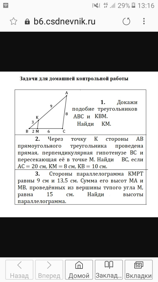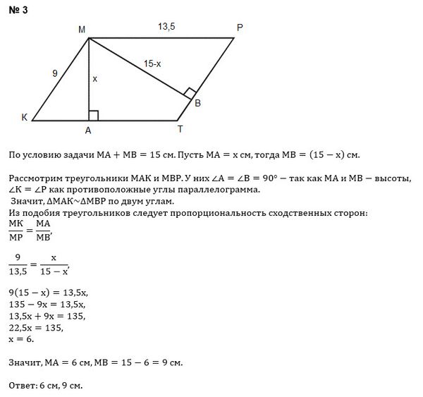 3. Сторо ны параллелограмма КМРТ равны 9 см и 13,5 см. Сумма его высот МА и МВ, проведённых из вершины тупого угла М, равна 15 см. Найди высоты параллелограмма.