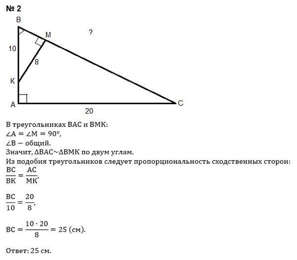 прямая, перпендикулярная гипотенузе ВС и пересекающая её в точке М. Найди ВС, если АС = 20 см, КМ = 8 см, КВ = 10 см.
