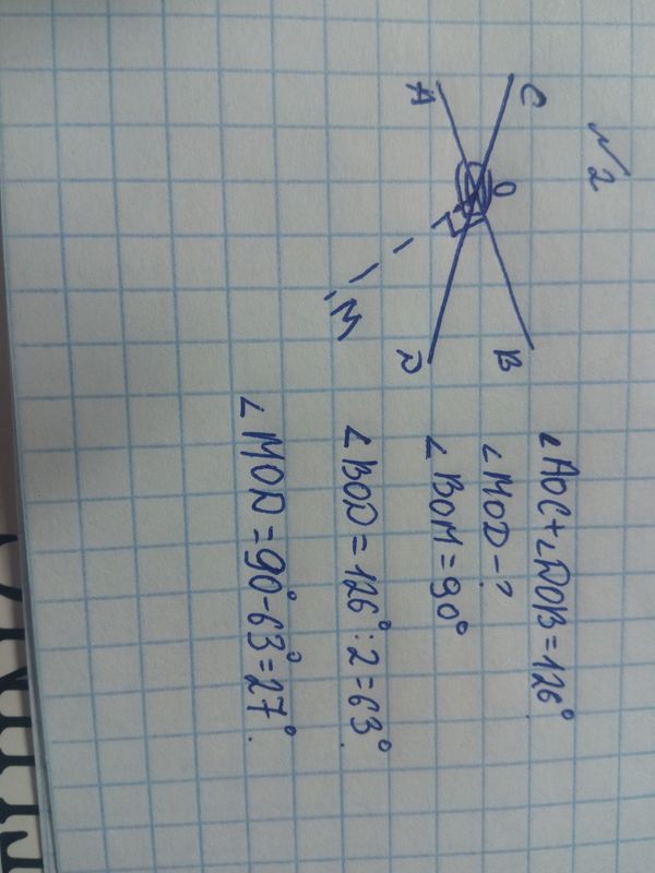 2. Прямые АВ и CD пересекаются в точке О. Сумма двух вертикальных углов ∠АОС и ∠DOВ равна 126°. Найти ∠MOD, если OM⏊AB, угол ∠MOD — острый.