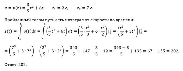 S = ∫_(t1)^(t2) v(t) S = t^3/5+3t^2 в переделах от 2 до 7 = 68,6+147 - 1,6 - 12 = 202