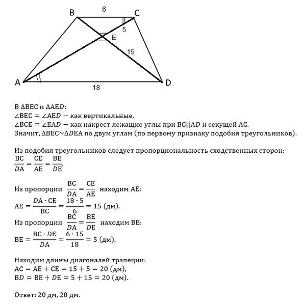 Диагонали трапеции АВСД пересекаются в точке Е. Найдите длины диагоналей если основания АД =18дм и ВС=6дм а отрезки ДЕ=15дм и ЕС=5 дм