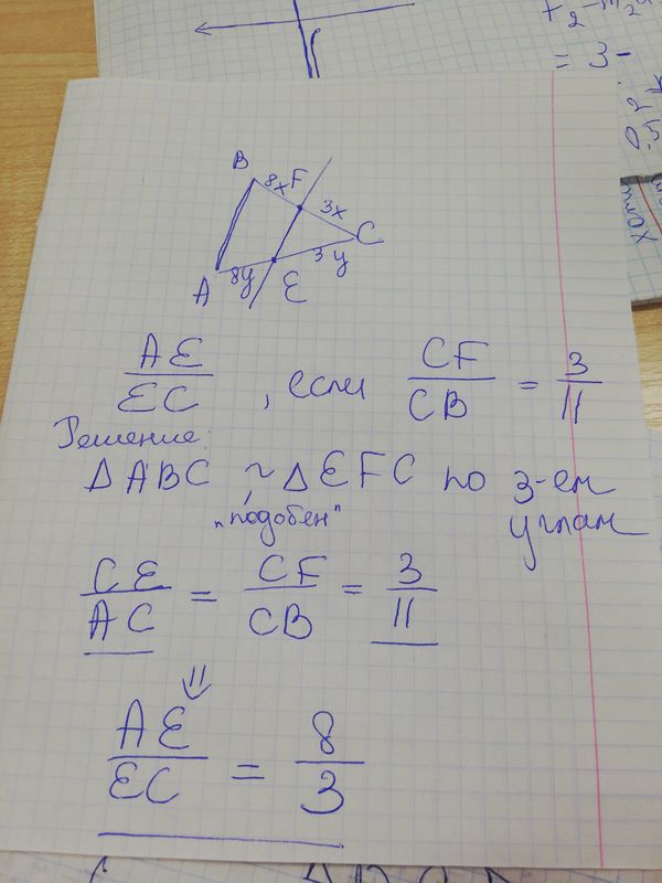 Плоскость АЛЬФА, параллельная стороне АВ треугольника АВС, пересекает стороны АС и ВС в точках E i F соответственно. Найдите отношение АЕ: ЕС, если CF: CB = 3:11