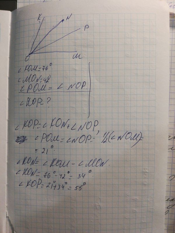 Луч O,N делит угол K,O,M на 2 угла: угол K,O,M=76°,угол M,O,N=42°. Луч O,P - биссектриса угла M,O,N. Найдите угол K,O,P