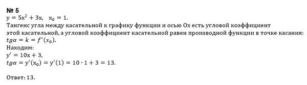 Через точку графика функции y = f(x) с абсциссой x_0 проведена касательная. Найдите тангенс угла наклона касательной к оси абсисс, если y = 5x^2 + 3x, x_0 = 1.