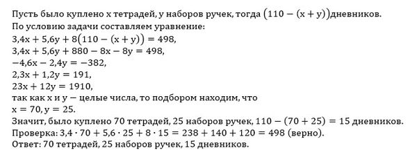 При подготовке к новому учебному году Наталья Петровна для учеников купила 110 различных товаров в канцелярском магазине. Общая стоимость которых составила 498 условных единиц. Какое количество тетрадей, наборов ручек и дневников к 1 сентября приобрела Наталья Петровна, если: стоимость тетради составляет 3,4 у.е., набора ручек - 5,6; дневника - 8?