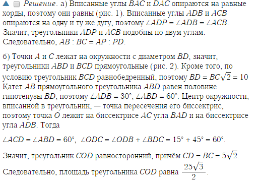 б) Найдите площадь треугольника COD, где O — центр окружности, вписанной в треугольник ABD, если дополнительно известно, что BD — диаметр описанной около четырёхугольника ABCD окружности, AB=5,