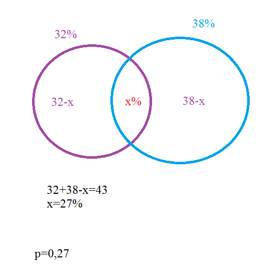 32% лампочек — с шершавой поверхностью, 38% — в упаковке, прич¨ем 43% — с шершавой поверхностью или в упаковке. Вероятность того, что лампочка — и с шершавой поверхностью, и в упаковке, равна (используйте точку вместо запятой для разделения целой части и мантиссы)