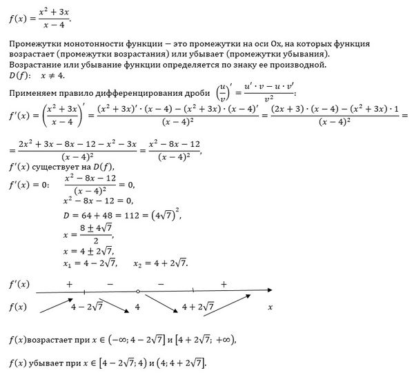 (знаменатель (х-4)^2>0, значит знак производной зависит от знака числителя. В числителе квадратный трехчлен. Коэффициент при х^2 положителен, значит между корнями квадратного трехчлена знак минус, слева от наименьшего корня и справа от наибольшего знак +)
