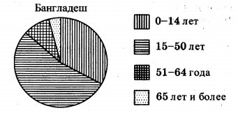 На диаграмме показан возрастной состав населения Бангладеш. Определите по диаграмме, доли населения каких возрастов составляют более 25% от всего населения.