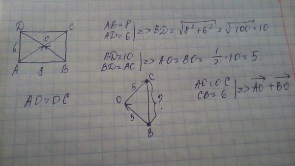 Две стороны изображенного на рисунке прямоугольника АБСД равны 6 и 8. Диагонали пересекаются в точке О. Найдите длину суммы векторов АО и БО.